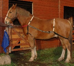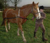 Most of us, even if only on the periphery of the horse world, are aware of horse loading problems. If you help run events, as I do, you may have waited patiently, or not so patiently, in a field waiting for the last person to load up go so you can close the gate and go home! It is very common that often well meaning people may offer help either in the form of brute force or other methods. Either they’ve just been on a Parelli course or seen Monty Roberts on the Satellite channel! What Cath Dennis has devised is a harness that puts the lone rider in a less vulnerable position when loading. She is BHS qualified, has studied Equine behaviour and is a lecturer at Aberdeen University. Her horse, Zenith, a 17.1 TB gelding, is very erratic in his loading behaviour and she never knows when a problem will occur. She developed the harness after watching her husband-to-be load Zenith using a lunge line in an unusual but effective way. The harness enables the handler to both lead and encourage from behind at the same time. When loading a fractious horse one person that the horse is familiar with doing all the “jobs” is preferable so every one is as calm as possible. Cath says that as we humans have a completely different “time scale” from horses, patience combined with the harness often works when all else has failed. It is designed to stay in place, can be put on anywhere and clips onto the breast bar of the trailer to stop the horse reversing out, once loaded. The handles/straps clip together for ease of handling. For safety reasons the breaking strain is 130kg so it cannot be used to just winch a horse into a place it would rather not be! Cath also recommends the harness for horse that are not particularly problematical but just to give the person confidence, especially if loading in a large, open or strange environment. The harness looks rather like a driving harness or breeching straps.