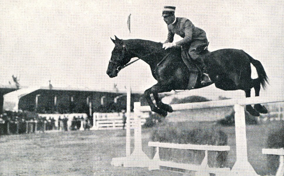 Occasionally, for a change in the afternoon, instead of working in the Campo Ostacoli, we were taken for a ride in the hills round Pinerolo; these usually took the form of a quiet hack along the roads up and down fairly steep hills, simply to exercise and muscle up the horses and give the ride a change of scenery; but occasionally, when any suitable steep banks were found, we were made to ride up and down them to strengthen the riders' seats and give them confidence. One of these rides, however, remains very clearly impressed on my memory, and I will try and describe it. We left barracks in single file, and proceeded through the town, the streets of which were paved with small, round, slippery cobbles. Presently we turned up a narrow alley which went up a steep hill. The hill got steeper and steeper, and there was a good deal of noise, clattering and slipping, and sparks flying from the horses' shoes. The hill eventually became so steep that the alley had to be made into a series of broad shallow steps; this, however, made the going easier except when one's horse put his foot on the edge of a step and slipped off. Eventually, amidst sighs of relief, we reached the top; but after turning one or two corners, to our dismay, we proceeded to go down a similar hill, and this was an even more nerve-wracking performance than going up. We then proceeded to ride up to the church, which is situated on the top of an isolated pinnacle, and the road up to it has to make several hair-pin turns. On arriving at the church, the Instructor rode through a narrow gateway into a stone passage, which turned sharp to the right with the church on one side and a wall on the other. I was rear file of the ride, and had not the least idea what was round the corner, but heard a considerable amount of noise and wondered why my horse was getting so excited, but I was not left in doubt long, for my turn soon arrived and my horse made one wild plunge through the gate, whipped round the corner to the right, nearly slipping up in the effort, and proceeded to charge up a flight of about fifty stone steps. The Instructor stood at the top shouting ‘Adajio’ at me, but nothing in the world would have made my horse go slower till he was at the top. We then proceeded to ride down a very steep grass slope, ending in a sheer drop of 5 or 6 feet into the road quite close to one of the hair-pin turns, so that if one's horse jumped out too wildly into the road, before he could stop himself he went straight on down another short, steep slope, and over a very much worse drop into the next bit of road. After this we were taken along a very narrow footpath, with a stream on one side and the road on the other, which gradually fell further and further away from the path. When the drop was about 6 feet, the Instructor turned his horse quickly and jumped down, and we all followed in single file and jumped down in turn at the same place. On a willing horse which would turn and go straight down without hesitating it was quite easy, but a nervous jockey on an unwilling horse was practically certain to go backwards into the stream. After this we were taken down two more steep grass slopes and then home. Besides the Campo Ostacoli, there was another large plot of ground in the middle of the town which belonged to the School, which was used as a Sports Ground and one end of it kept as a show-jumping ground, and here their show-jumpers were schooled two or three times over the exact course before going away to compete in any shows. In addition to this, about 3 miles from the School there was a large bit of land known as Baudenasca, which corresponded to the Vervie at Saumur. Baudenasca was a large acacia wood, round the outside of which was a broad grass gallop about 3 kilometres round. Branching off through the wood from this track were many other grass rides, and branching from these grass rides were many little, narrow twisted tracks. On the main gallop round the edge of the wood there were no fences, but down the rides and tracks one met obstacles of every kind and sort. In the middle of the wood there was a large clearing, and this was divided up into several paddocks, and some old farm buildings had been made into loose boxes. These boxes and paddocks were used for horses requiring a rest for any length of time. Baudenasca is not used at all at the beginning of a course, and I saw no work being done there, but I shall never forget a ride I had there the day before I left to go on to Tor di Quinto. The Chief Instructor, the Instructor of my ride, and other Instructors, a Swiss officer and myself, were driven out one afternoon to a place about 3 miles from the School, where the country was wild and uncultivated. Here we found horses waiting for us, and, having mounted, proceeded to gallop across country. The going in most places was very rough and rather stony, and full of small bushes and trees, and was rather like bits of country one meets occasionally whilst pig-sticking in India, but in this case we had no wild and savage boar in front to urge one on and distract one's attention from the unpleasantness of the going; and at the beginning, riding very short in a snaffle on a horse that was pulling a bit, dodging trees and bushes, I was far from happy, but after a mile or so one learnt to sit more easily and leave one's horse alone. With the exception of one short halt to give the horses a blow and occasional short trots over a stony river bed or through a wood, we must have galloped for quite 5 miles and finished up at Baudenasca. Here we gave our horses another short breather and then started off, playing follow-my-leader up and down and in and out of the rides and tracks, and some of the obstacles which we came across very suddenly and unexpectedly gave one's nervous system a considerable shock, but one's horse negotiated them all with the utmost ease, and one soon ceased to worry about what was coming next. After about five minutes of t